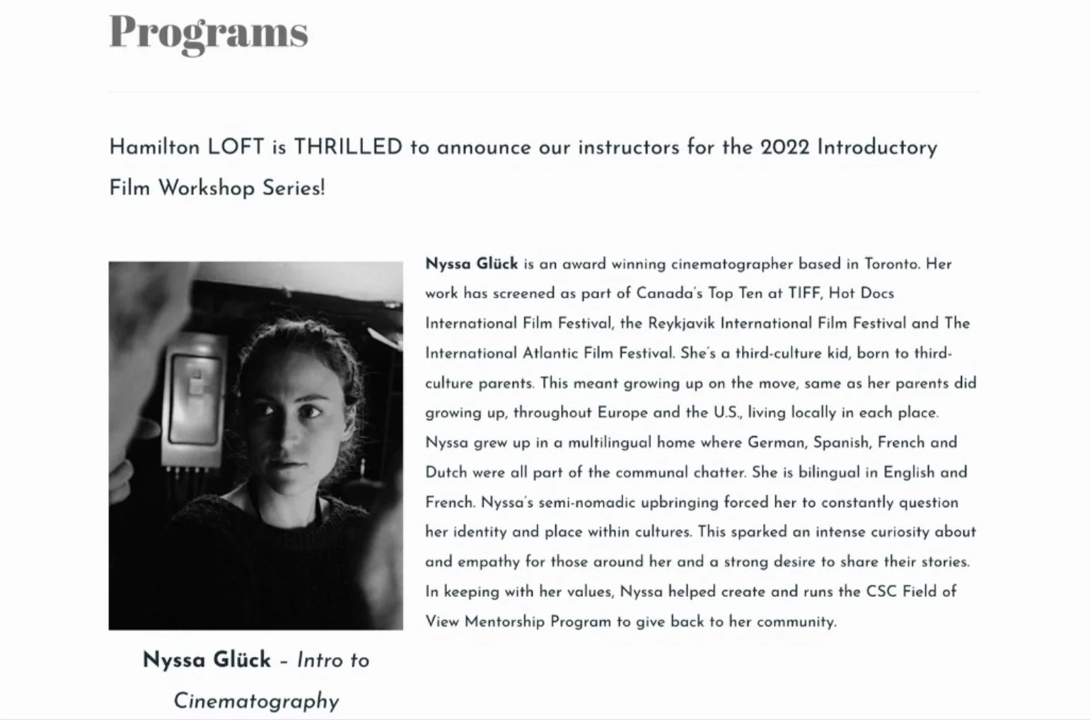 In 2022, Nyssa taught the inaugural cinematography workshop for The Hamilton LOFT Community. The Hamilton LOFT (Ladies of Film & TV) seeks to help break these barriers and bring together people who identify as womxn working in all areas of filmmaking.